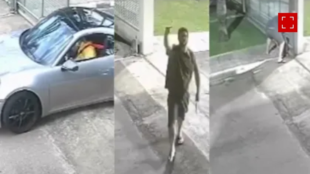 Imagens das câmeras de segurança mostram o homem, em aparente estado de fúria, destruindo parte da infraestrutura do condomínio.