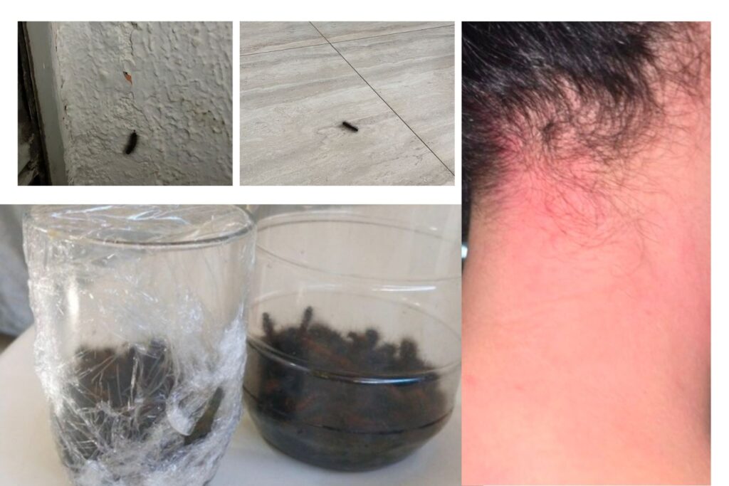 De acordo com os moradores, o terreno está tomado por lagartas, e algumas pessoas já teriam sido picadas. Em um dos registros feitos pela própria comunidade, uma garrafa parcialmente cheia mostra a quantidade de lagartas recolhidas nas proximidades do lote, evidenciando a gravidade da infestação.